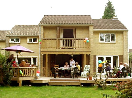 Included is a raised octagonal dining area for 8 or more, surrounded by a chunky timber balustrade and an apple tree