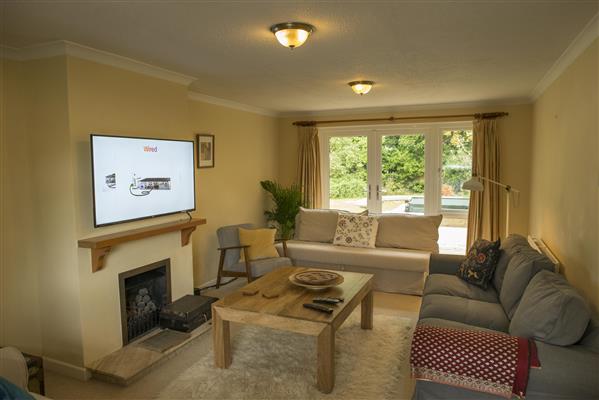 Large lounge with French doors opening up to the large deck and gardens with views of the trees and the studio.