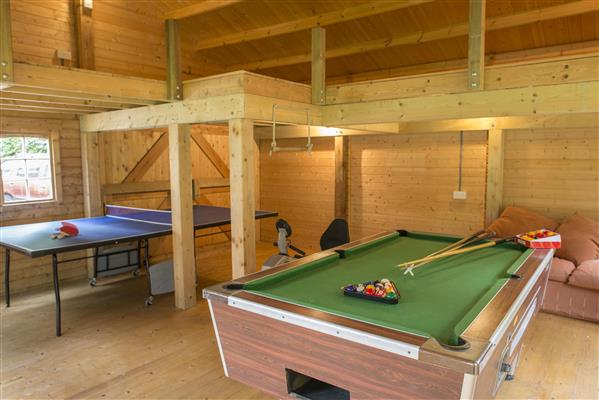 There is a full-size pool-snooker table and rowing machine. The log cabin has two sets of French doors that lead out to the garden, plus a pair of large doors