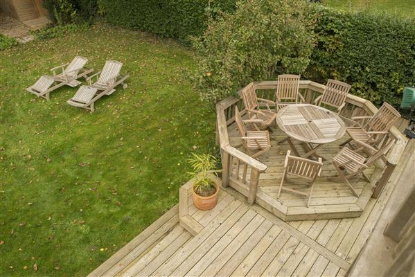 The beautifully-shaped deck overlooks the large gardens of lawn and flowerbeds and wooden garden steamer loungers.